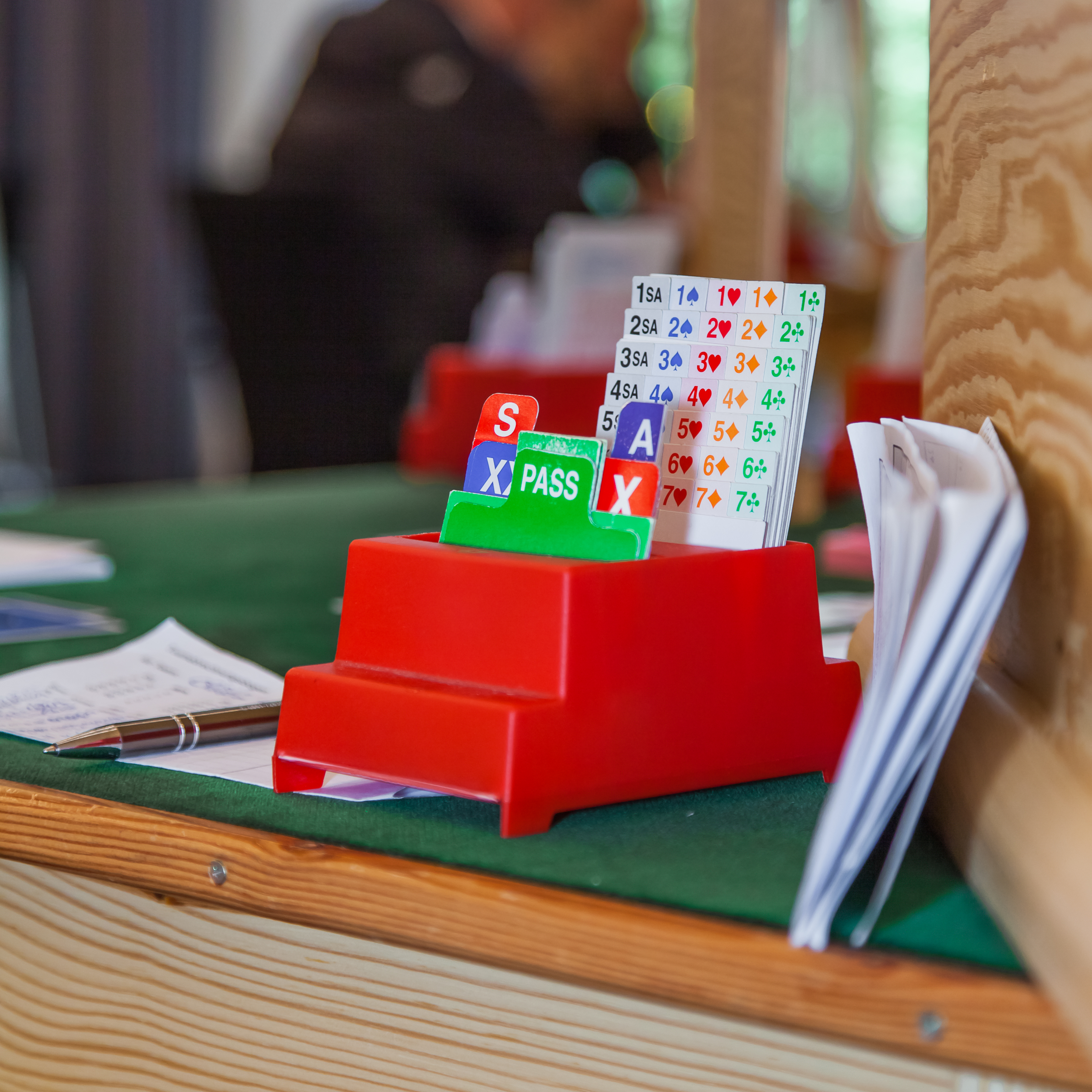 Bridge ist ein anspruchsvolles, strategisches Kartenspiel. Damit die beiden Partner sich in Turnieren nicht unerlaubt absprechen können, werden Sichtschirme aus Holz diagonal auf die Spieltische platziert. Foto: Jana Wenderoth